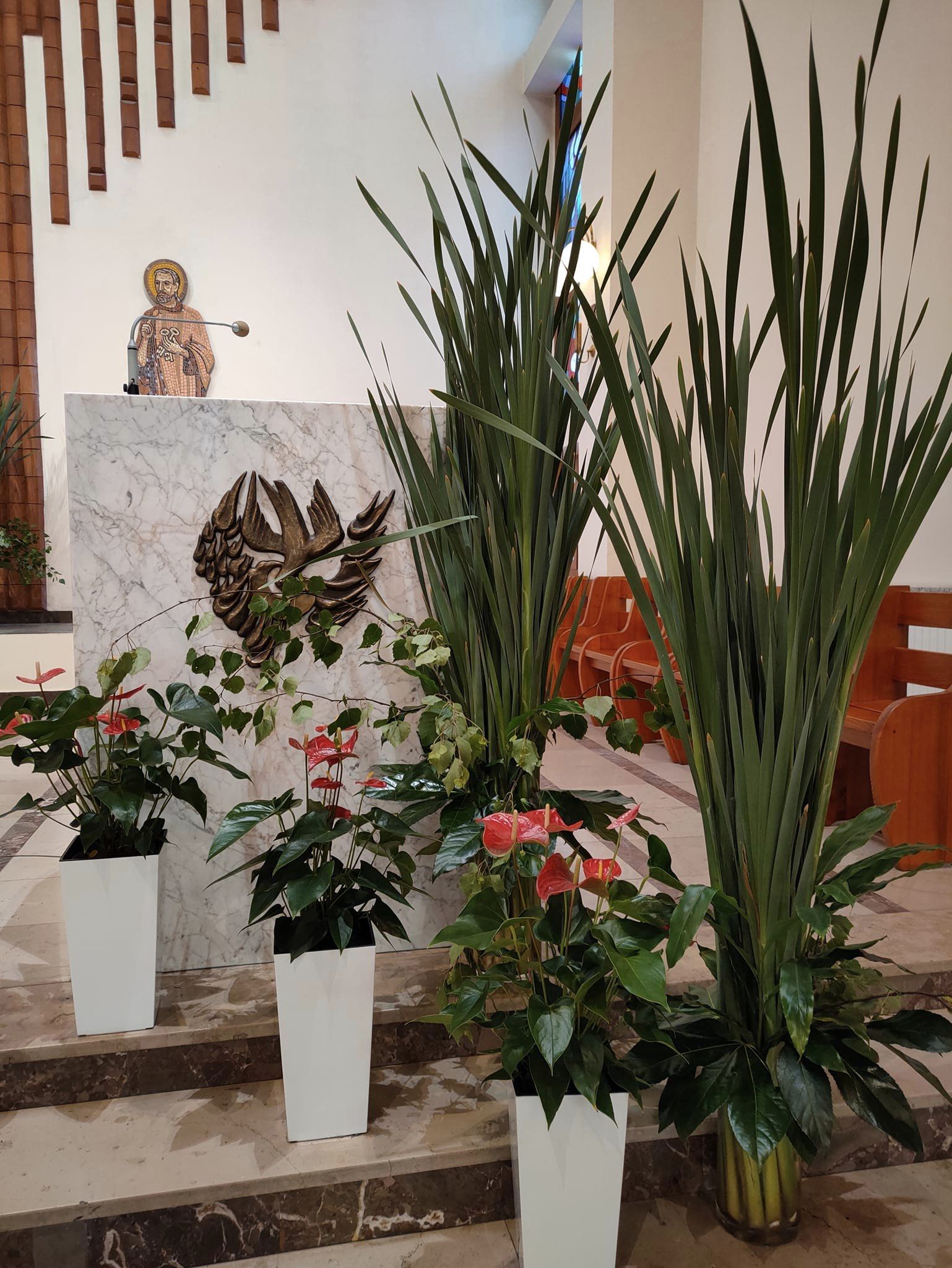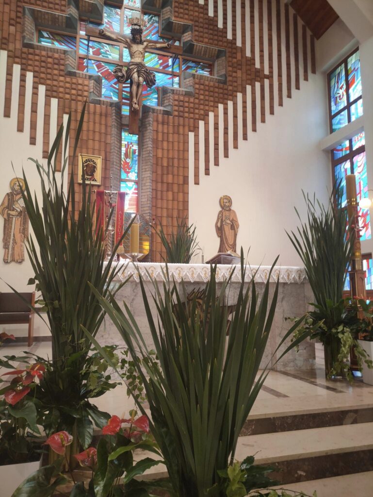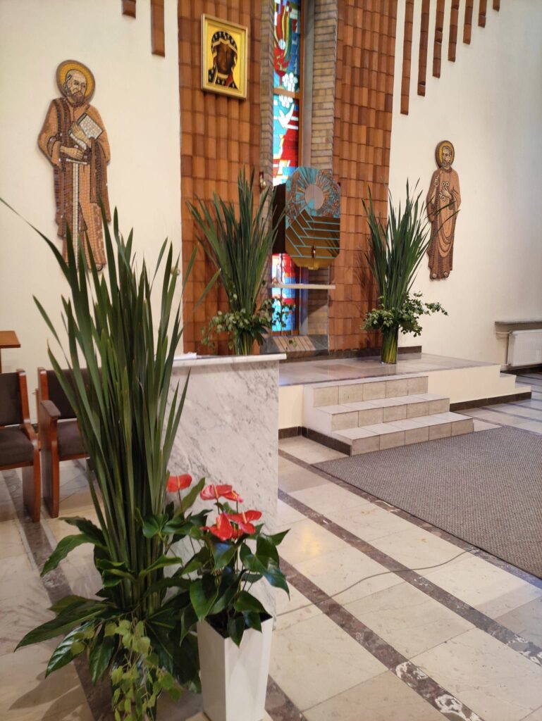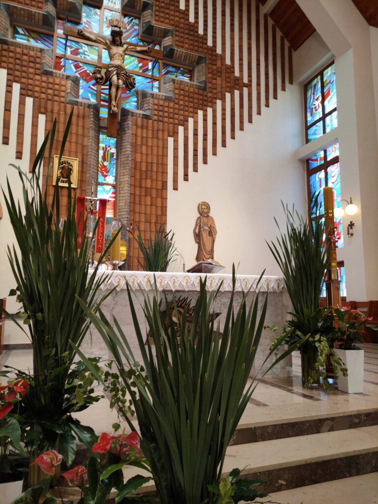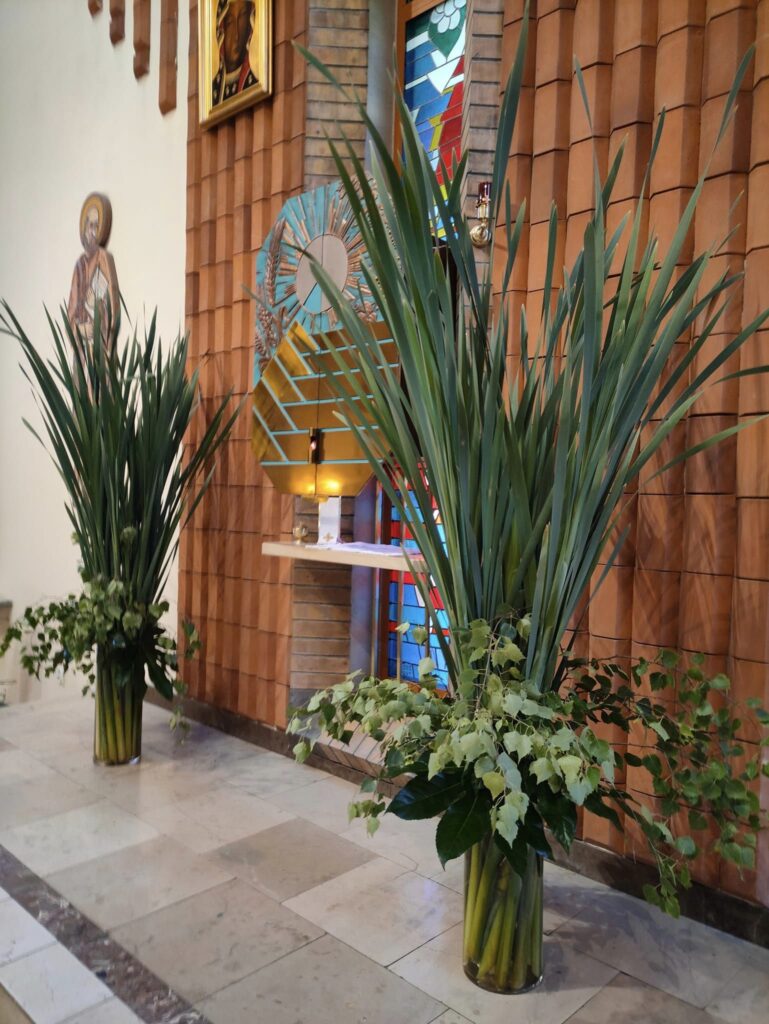 Dekoracja w naszym kościele na Zesłanie Ducha Świętego 27 maja 2023 Zesłanie Ducha Świętego – dekoracja w naszym kościele. Wydarzenia dekoracje, dekorowanie kościoła, tatarak, Zesłanie Ducha Świętego